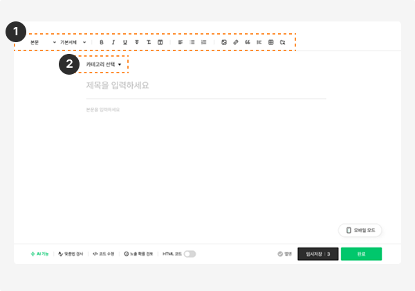 - 1글쓰기를 마친 후, ‘완료’ 버튼을 클릭하면